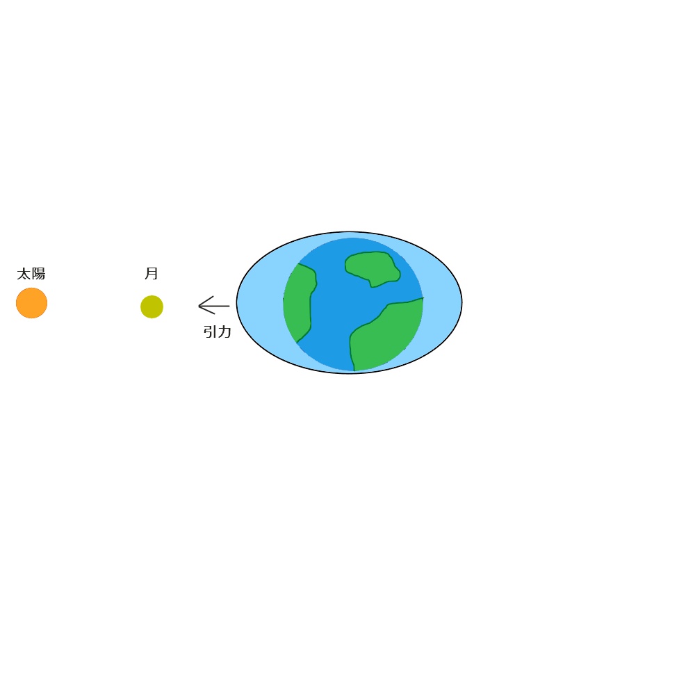 海水が月の引力で引っ張られ、海水がつぶれたボールのようになるイメージ。